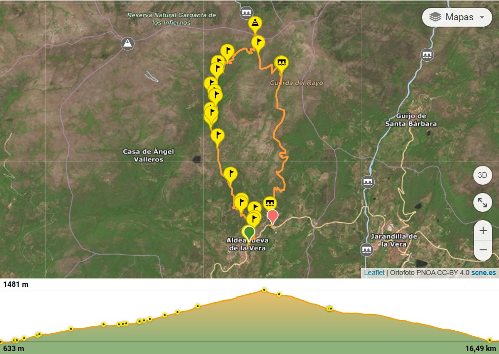 La ruta comienza en el Mirador de Aldeanueva de la Vera. Desde aquí, sigue el sendero que te llevará al Collado de la Yegua. Verás carteles con descripciones del camino. A lo largo del recorrido, podrás apreciar lavandas florecidas y, en lo alto de la sierra, las escoberas de color amarillo. Además, en pleno mayo, podrás disfrutar de una cascada de agua junto a un pequeño regato que desemboca en la conocida garganta San Gregorio. Las vistas desde el Collado de las Yegüas, a 1448 metros de altitud, son espectaculares y permiten contemplar parte del Valle del Jerte.